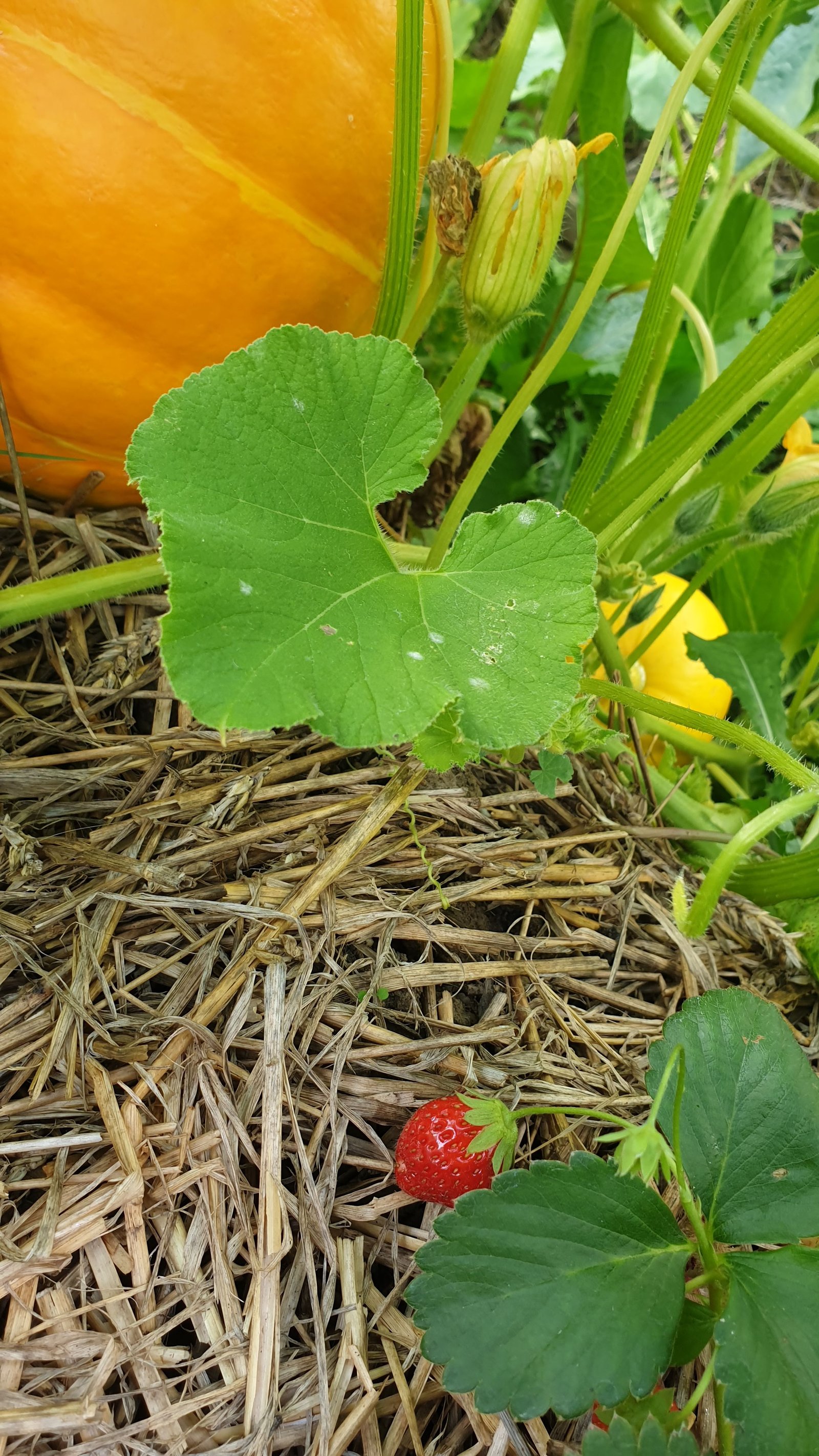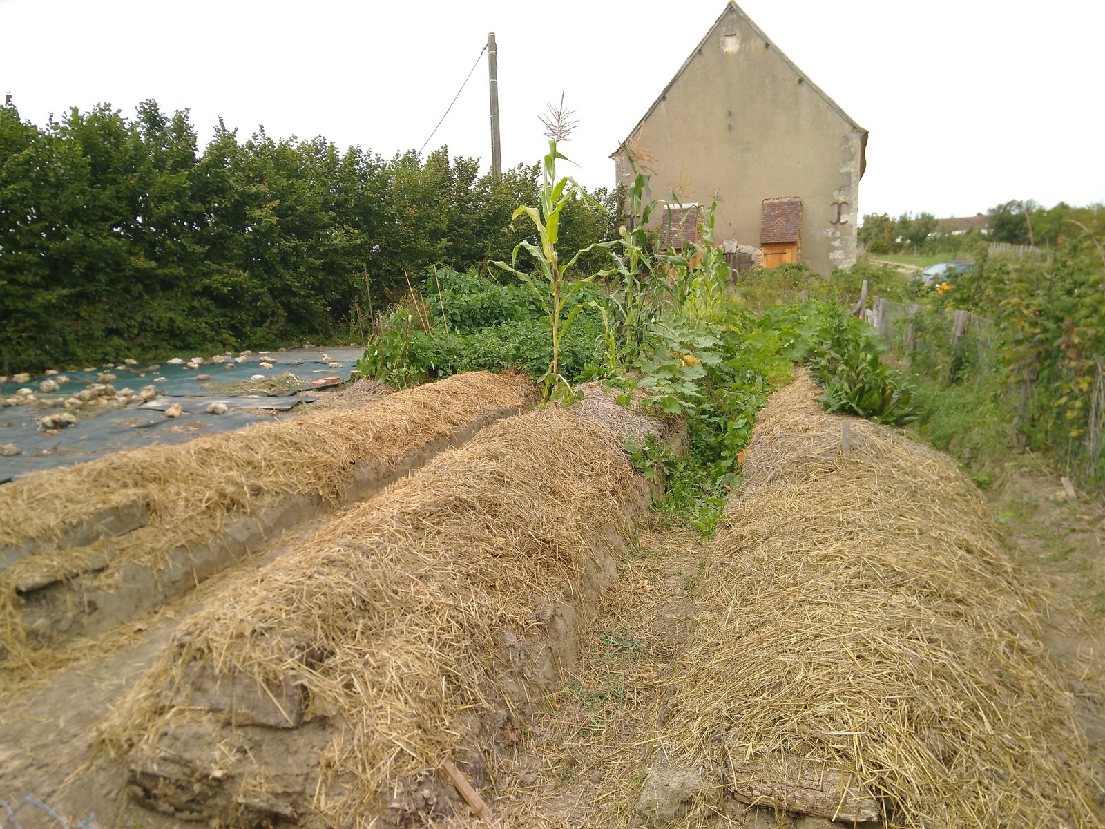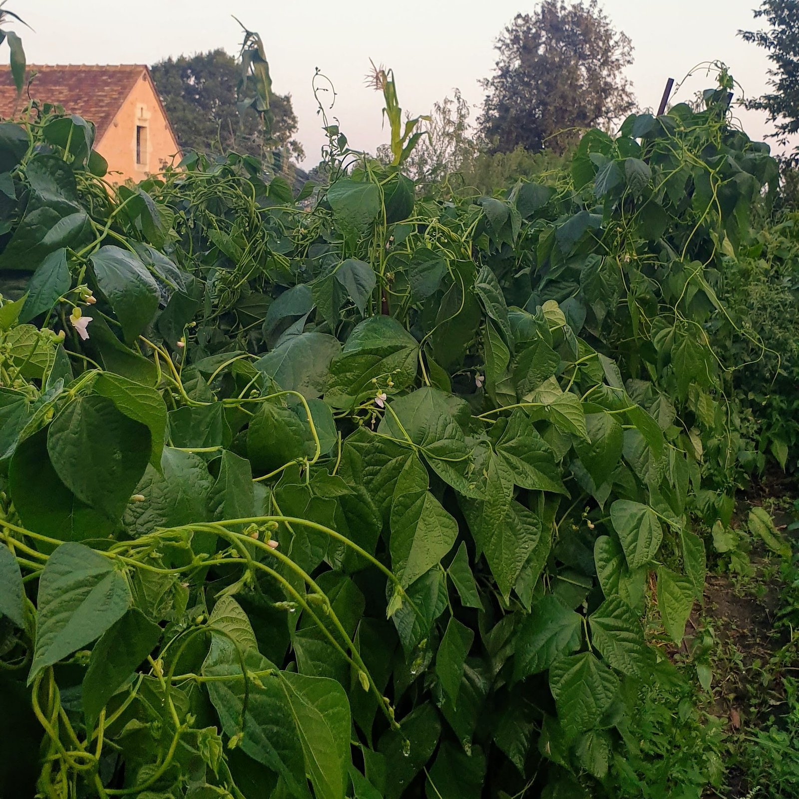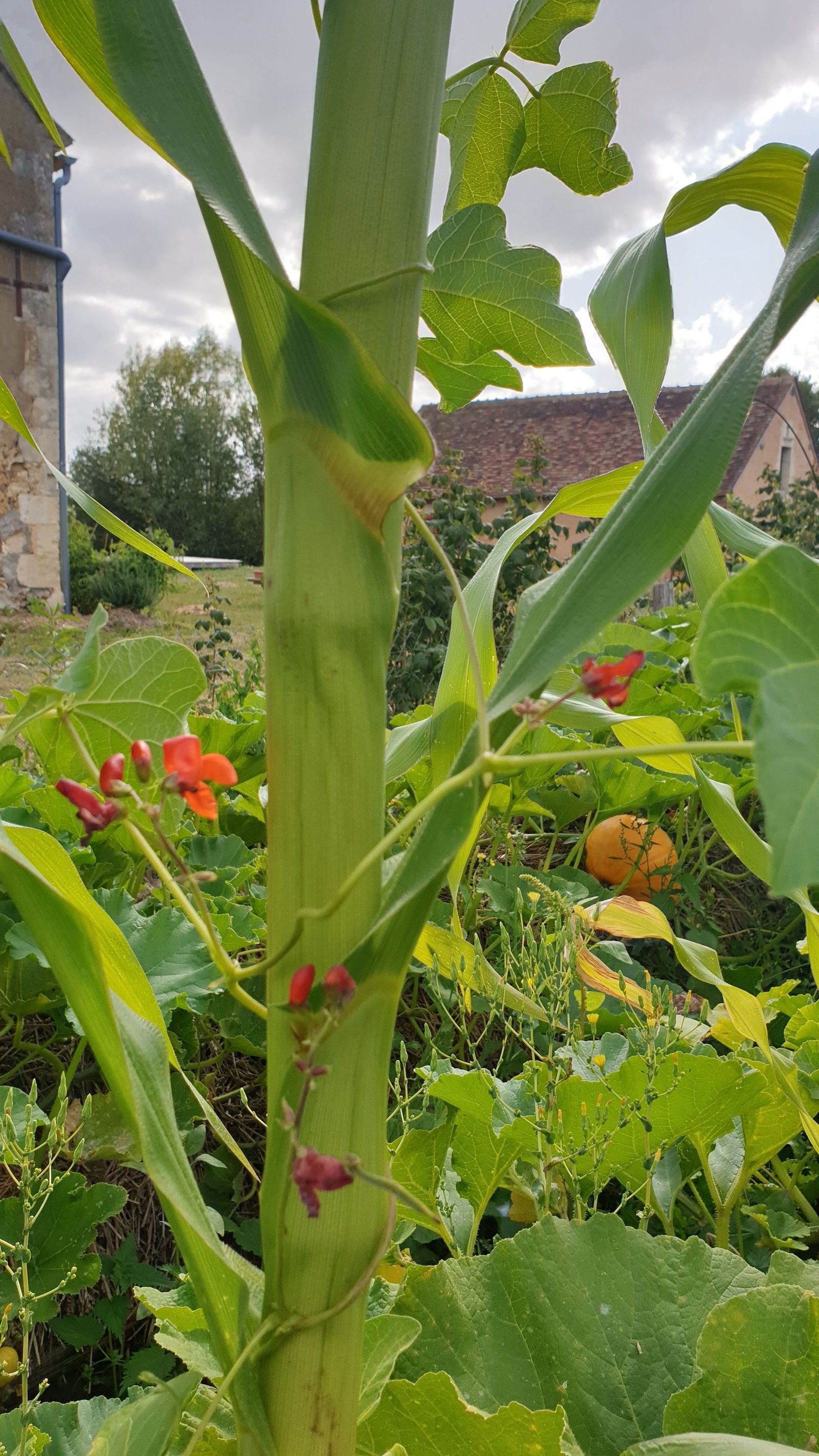 Nous avons finalement atteint la sainte trinité (en termes de permaculture !) : maïs, haricots et courges. Le maïs monte. Les haricots montants grimpent autour du maïs et ajoute de l’azote au sol. La courge recouvre le sol et le garde frais et exempt de plantes concurrentes. Cette technique des « Trois Sœurs » remonte aux Amérindiens.