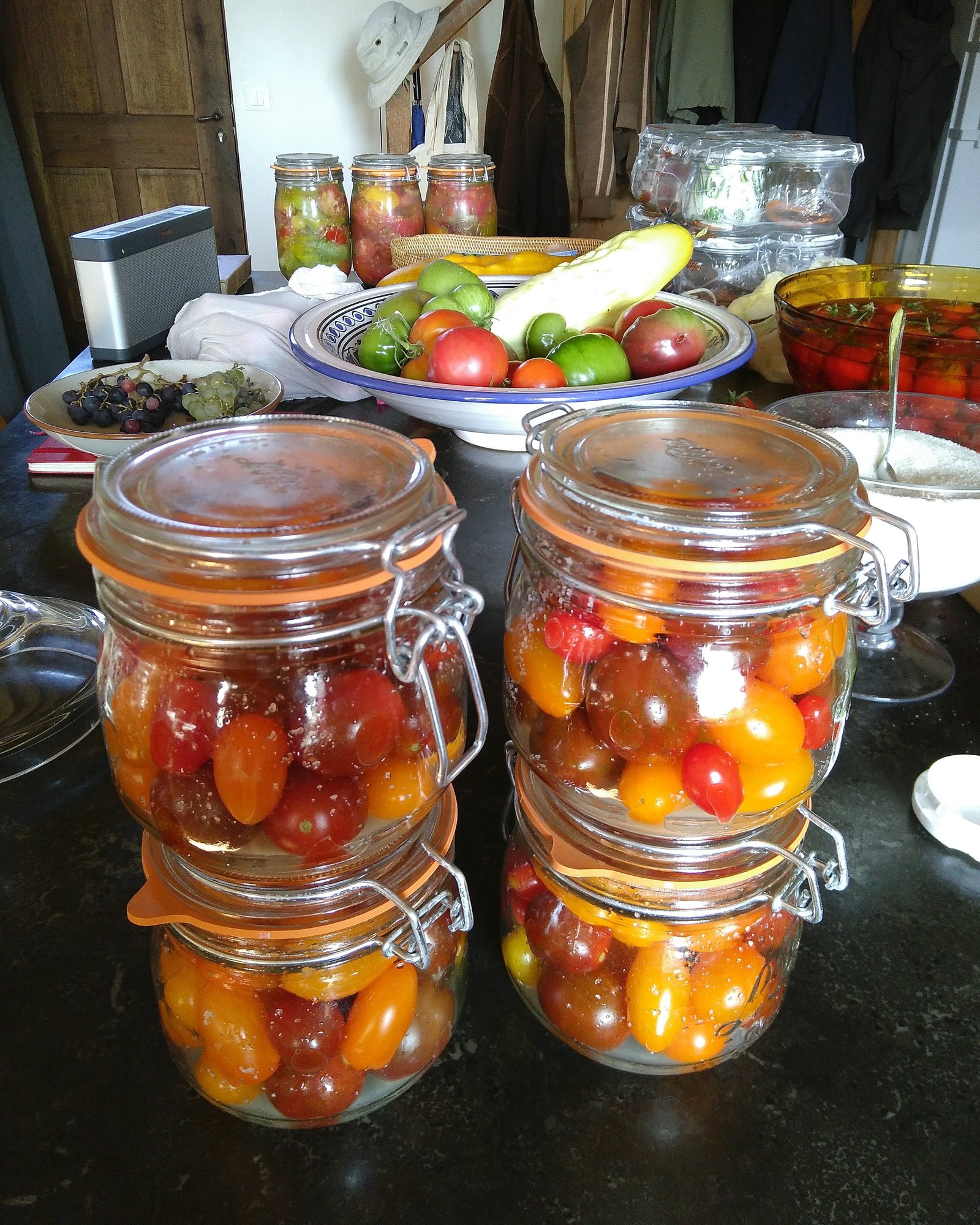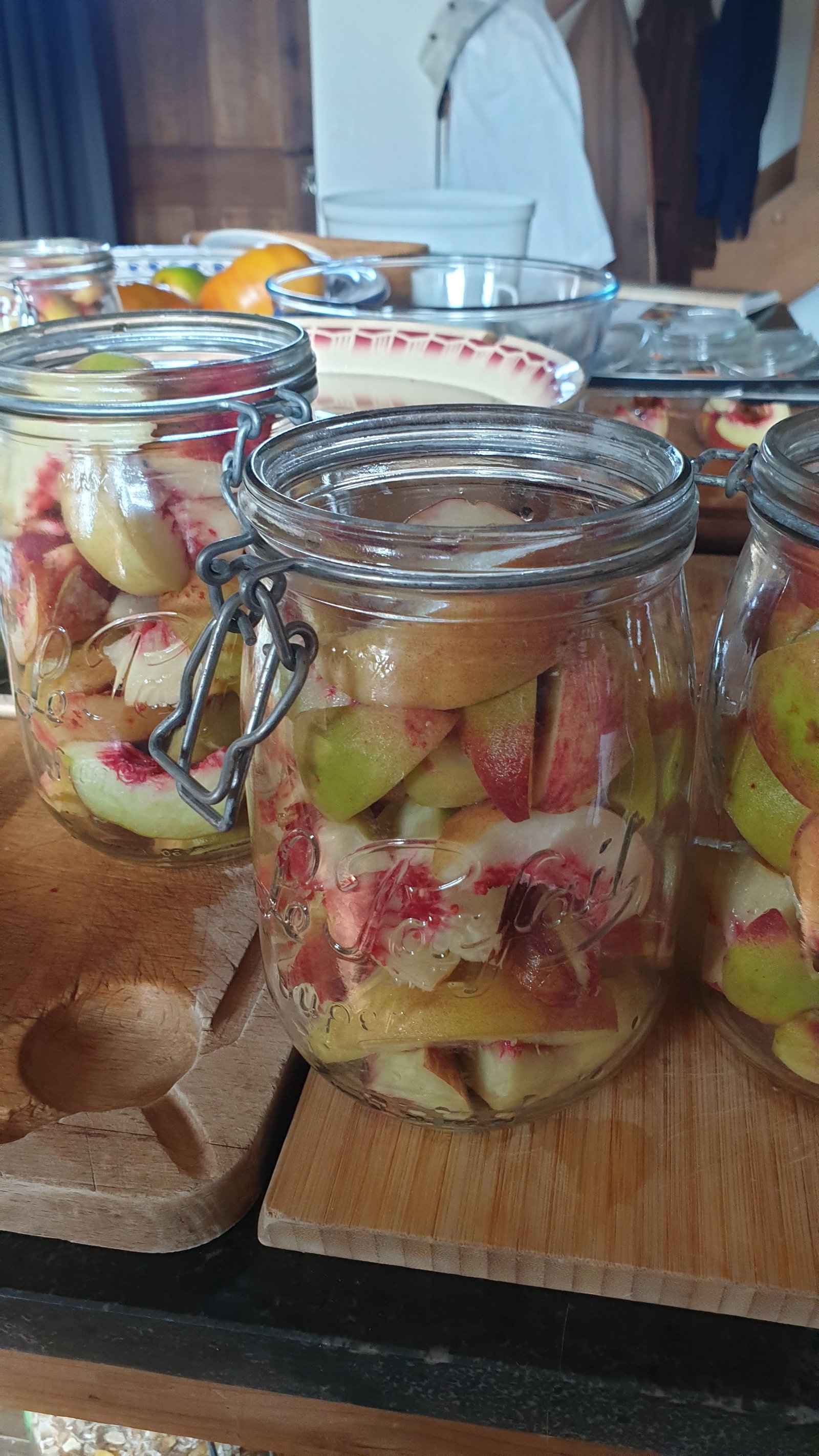 Nous avons été très occupés à faire des bocaux pour l’hiver : soupe à la citrouille, pêches au sirop, tomates, purée de pommes, haricots, la totale…