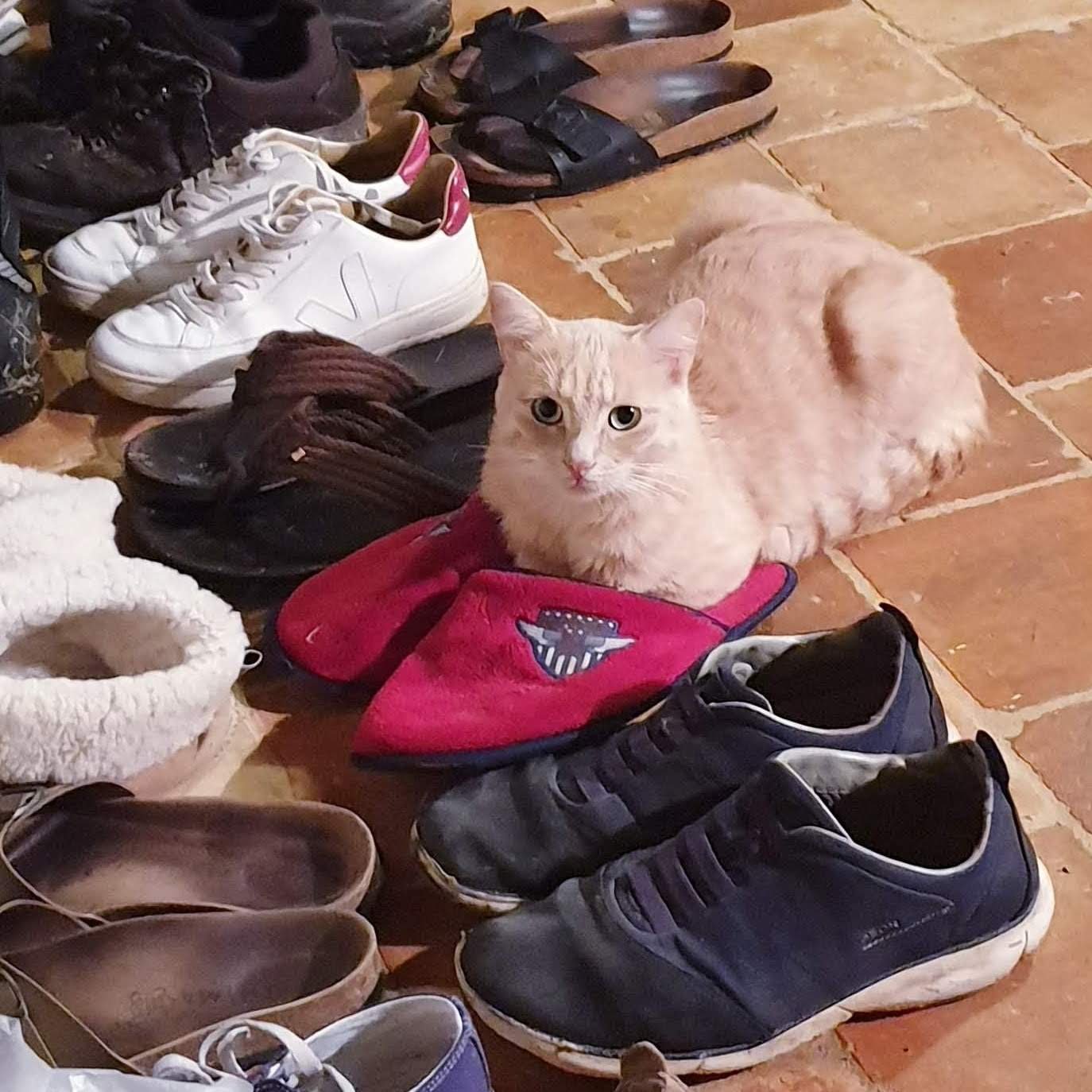 Malheureusement, Thelma (en haut à gauche) est devenue une tueuse impitoyable de petits mammifères, y compris, plus récemment, d’un lapin, qu’elle a gentiment laissé pour que nous, végétaliens, puissions le manger ! Nous l’avons presque persuadée de ne pas amener sa proie dans notre chambre à 6h du matin pour le dernier jeu / torture / mise à mort. Louis, qui est beaucoup moins aventureux et préfère un style de vie plus sédentaire (cf. son amour des pantoufles rouges en haut à droite), chassait les papillons ou lançait les carcasses de Thelma comme si elles étaient des bouchons de champagne jusqu’à tout récemment. Mais il a maintenant attrapé et tué sa première souris. Trop mimi mais aïe !!!
